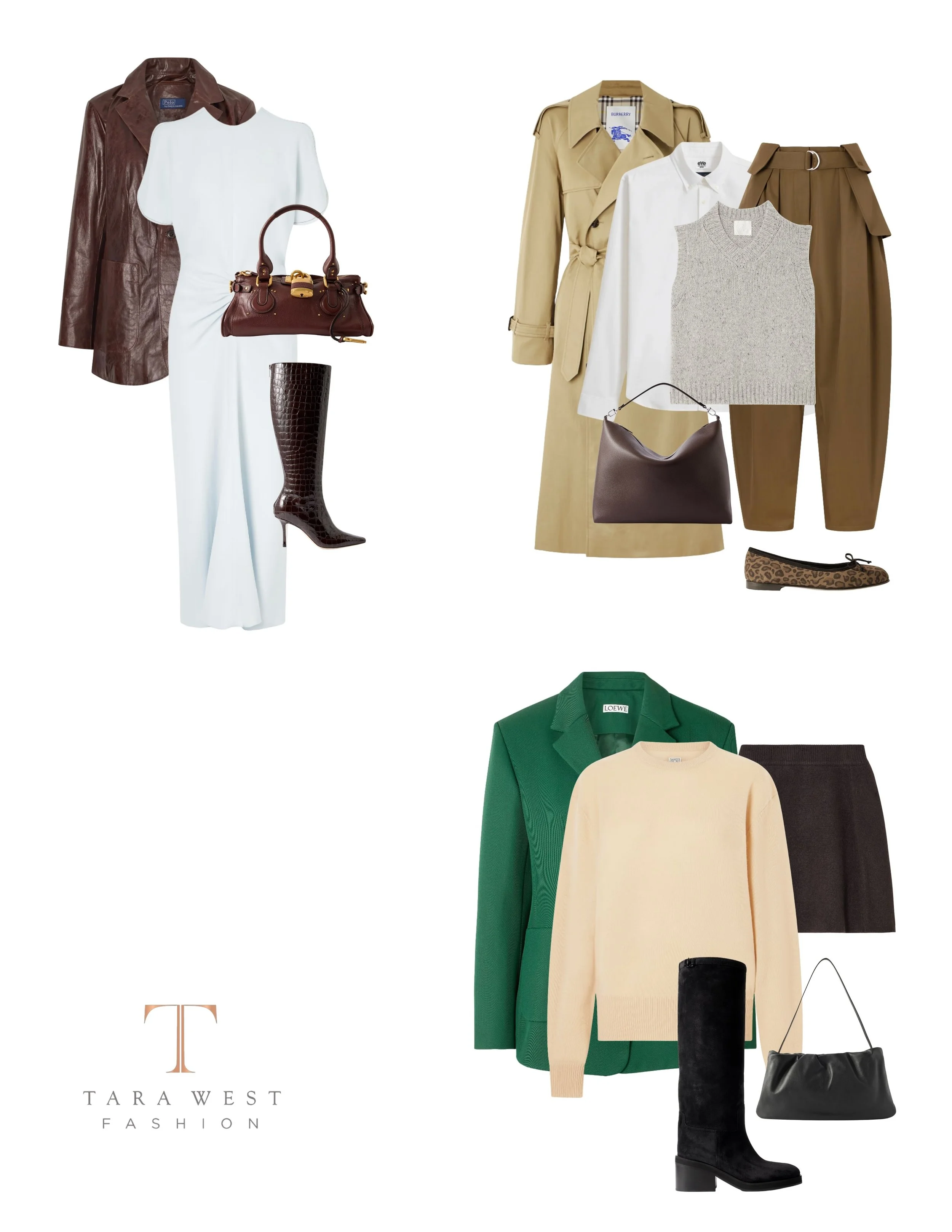This is one of my go-to formulas for clients who want to look polished but effortless. Start with a cream lightweight knit sweater layered over a fresh, white button-down. Pair it with tailored camel trousers for a sophisticated base or straight leg denim for a more casual take. Add a structured trench coat, a transitional wardrobe hero that instantly makes an outfit feel intentional. Finish the look with leather loafers or sleek ankle boots and a structured tote.